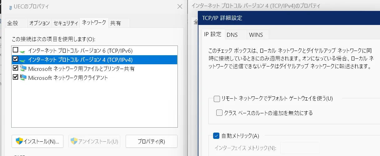 すべての通信をVPN経由で行うようになっているのを解除する。Win+Rなどで「ファイル名を指定して実行」を開き、ncpa.cplと入力して実行、「UEC」を右クリック→「プロパティ」→「ネットワーク」タブへ進む。
