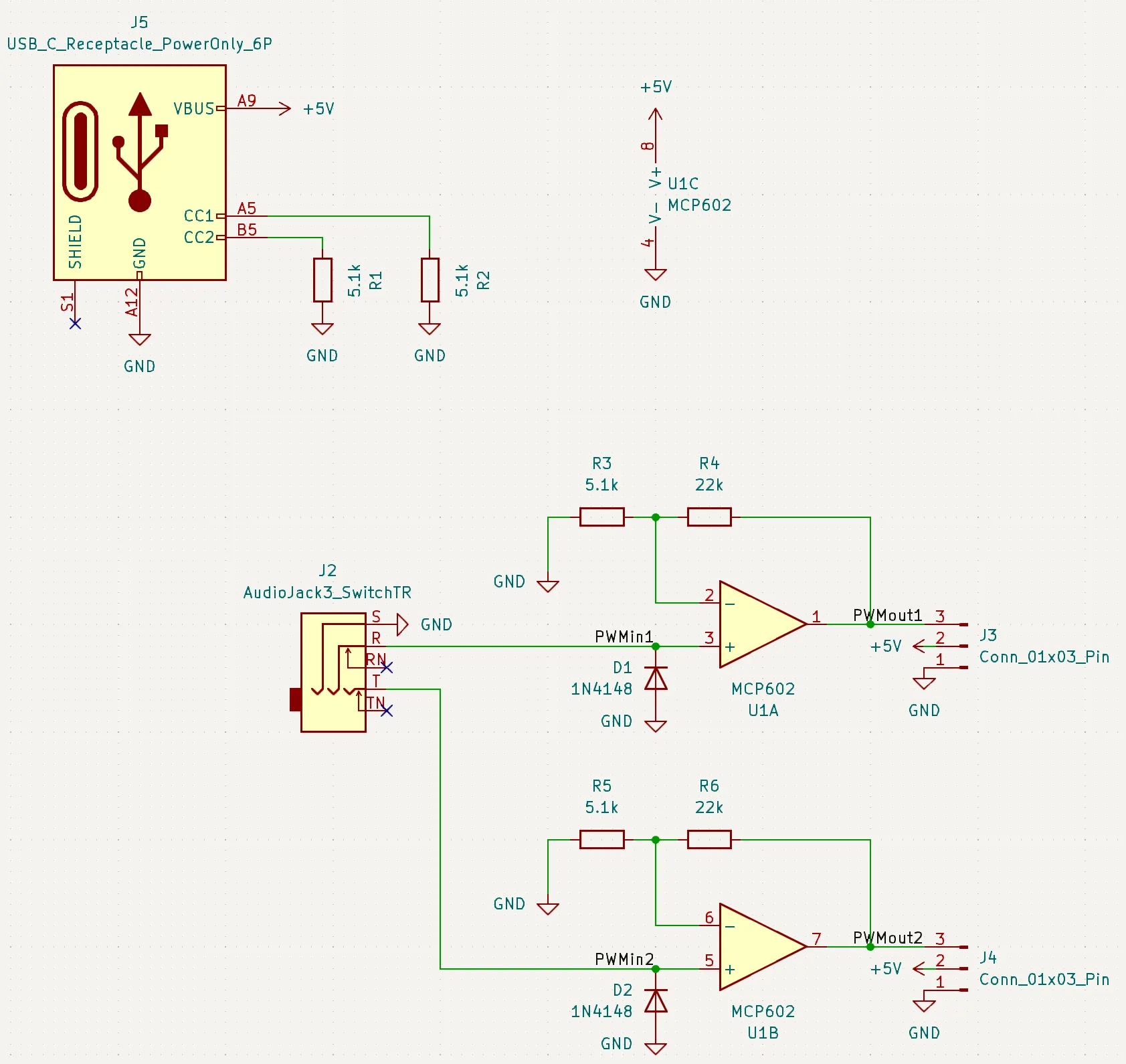 まず、電源はUSB Type-Cから取ることにした。サーボの電源電圧はたいてい5 V程度で、USBの標準での電圧も5 Vのため、そのままつなぐだけでよい。ただし、Type-CでないUSBでは電流は500 mAか900 mAしか取れずサーボを動かすには心許ないため、最低でも1.5 A取れるType-Cを使うのが無難である。