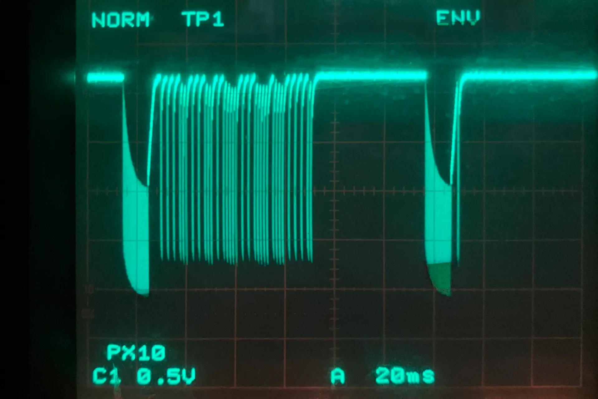 エアコンのリモコンがどのような形式で通信しているのかを調べる必要がある。エアコンのリモコンは壊したくないため、赤外線として送信された信号を受信して解読する。オタクが腐らせていた赤外線受信器OSRB38C9AA(Active Lowなので注意)を借り、出力をオシロスコープで観測してみたところ、開始、終了の信号と、0/1とHIGH/LOWの対応はNEC形式と同じであり、データ長のみ拡張されて23バイトになっていることが分かった。