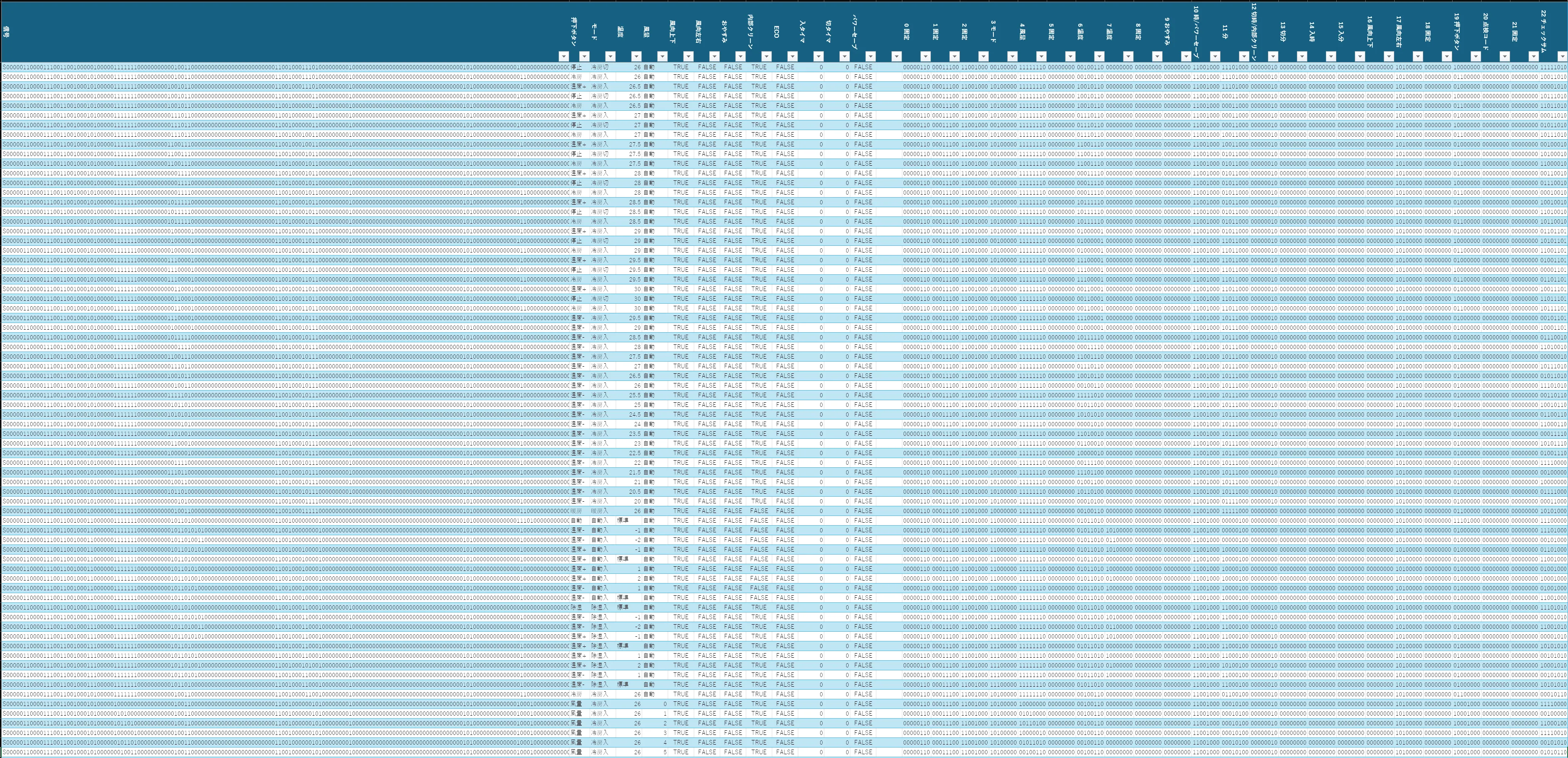 データが長いため、押したボタンだけを送信しているわけではなく、リモコン側が状態を保持していて毎度全て送信している方式であることが予想される。受信した信号のビット列と設定されていた状態をまとめる表を作成し、設定を網羅するように操作してデータを集めた。ビット列をバイトごとに区切り、設定と対応するバイトを探し出し、当該行をコピーしてExcelの「重複の削除」を使うことでビット列と設定との対応を得ることができた。