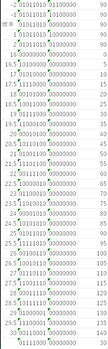 温度はリモコン上では0.5 °C刻みだが、データ上では0.1 °C刻みだった。また、風量はリモコン上では6段階だが、データ上はなんと100段階だった。どちらも変化を測定する術がないため、リモコンから送信され得ない値を送信した場合の本体の挙動は謎である。